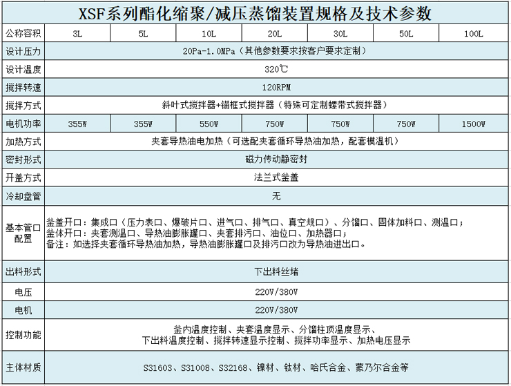 反應釜的結構形式、壓力高低、加熱方式、攪拌槳形式可根據用戶技術條件需要進行設計制造,選用材料可根據用戶反映介質需要,制造各種不銹鋼、鈦、鎳以及碳鋼反應釜、反應塔、反應罐、冷凝器、換熱器、儲罐等以及非標準化工設備。可根據用戶技術條件生產磁力偶合器與反應容器配套,其大小可以任配。